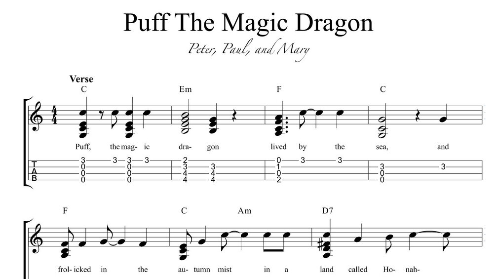 This is a PDF download of "Puff the Magic Dragon" by Peter, Paul, and Mary. It is arranged for ʻukulele and transcribed in standard notation/TAB.